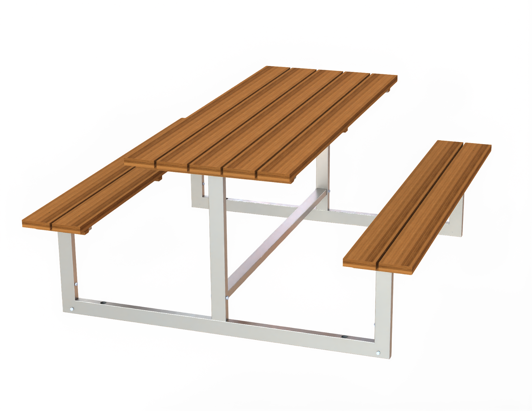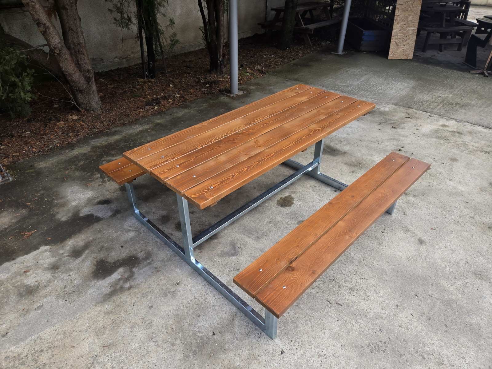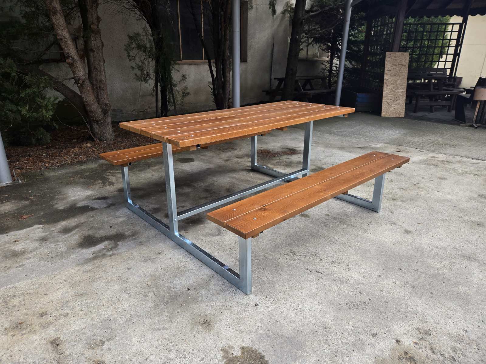 Комплект дървена маса с пейки без облегалки, с метална контрукция. Подходящ за за стационарно поставяне в паркове, градини, дворни пространства, заведения за хранене на открито.