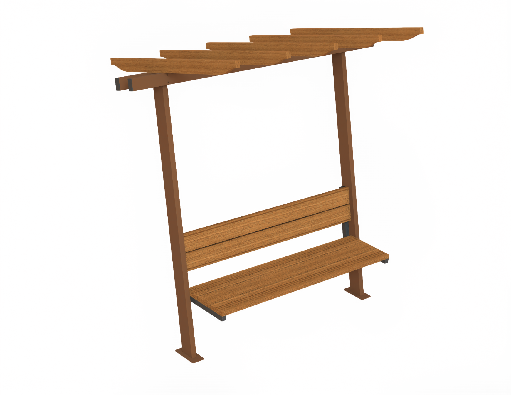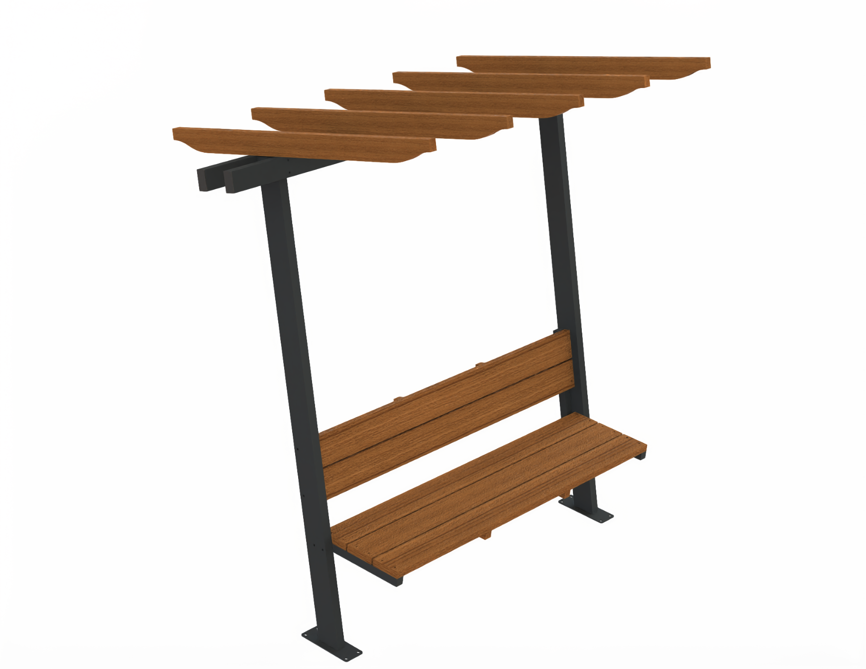 Паркова пергола с пейка. Метална конструкция (колони, носачи и конзоли), дървени седалки, облегалки и ребра. Използвана е подбрана и изсушена иглолистна дървесина, импрегнирана и лакирана с лакове за външна употреба. Перголата може да се монтира чрез замонолитване с бетонни фуднаменти в мека настилка (трева, пръст) или чрез анкериране към съществуваща бетонна плоча. За постигане на сянка, възможна опция е поставянето на текстилна част.